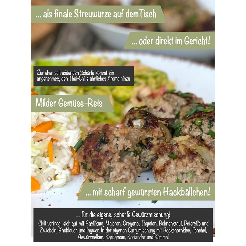 - 100% intense sharpness – fits wonderfully with meat, stews, pasta, soups and sauces, salsa or spicy dips. Also great with vegetarian dishes such as grilled cheese, vegetables or savory rice dishes and can be used well by chili beginners. To further intensify the aromas and sharpness, roast the desired amount of chilli briefly in oil