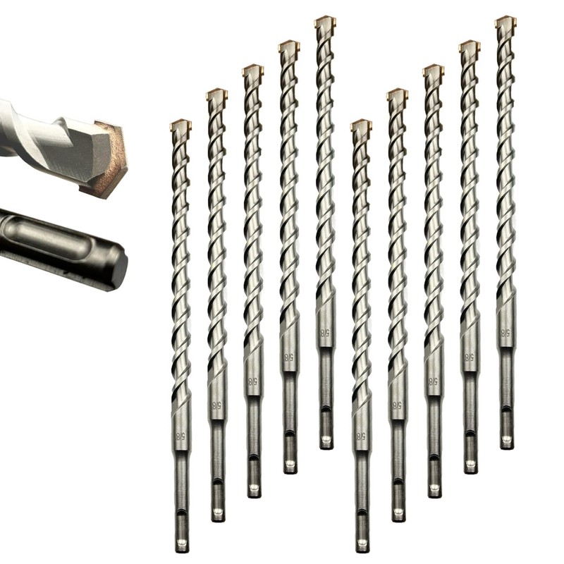 Direko Carbide Tipped Rotary SDS-Plus Hammer Drill Bit Set includes ten pieces of 5/8"x6" drill bits. Tungsten carbide tips provides high level wear resistance, it is fit for different materials such as masonry, concrete, marble, granite etc. U-flute provides less friction and better dust removal for faster drilling.