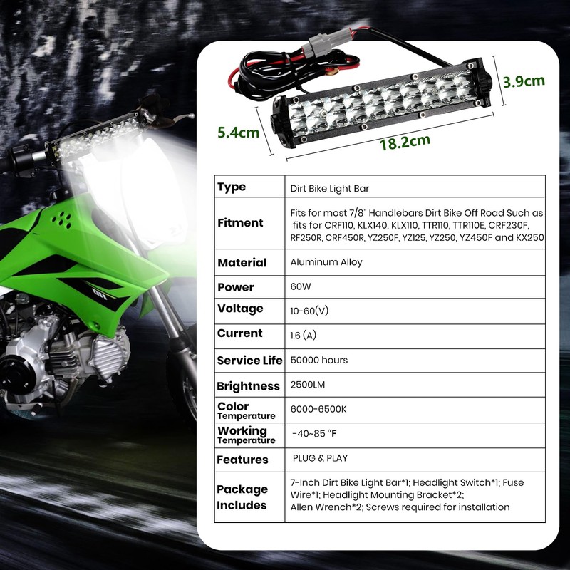 Dirt Bike Light Bar Universal for Most 7/8" Handlebar Motorcycle, Fits for CRF110 KLX110 TTR110 YZF450 RM85, 7-Inch 60W 6000-6500K Clear Headlight, Plug and Play