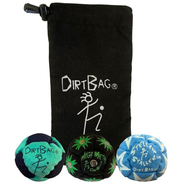 DIRTBAG All Star Footbag Hacky Sack 3 Pack with Pouch, 100% Handmade, Premium Quality, Bright Vivid Colors, Signature Carry Bag - Green/Black