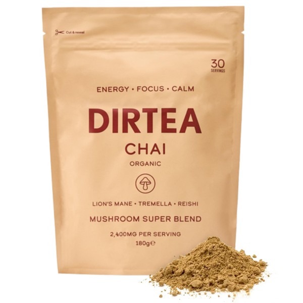 Product descriptionDIRTEA Chai is a bold, functional blend of chai spices and functional mushrooms, thoughtfully curated and consciously made, it's designed to bring focus, balance, and calm to your day. Infused with Lion's Mane for cognitive clarity, Tremella for skin hydration, and Reishi for tranquillity, this richly spiced brew supports your mind and body with functional wellness. DIRTEA Chai delivers 2,400mg of functional mushrooms per serving and is fortified with an organic B vitamin complex, including B6, B12 and B5 to support psychological function, the nervous system, boost energy levels and reduce tiredness and fatigue. Simply add hot water, stir, and enjoy a cup of this spicy warming blend.IngredientsBlack Tea 0.2g Contains small amounts of caffeine for steady energy, and is rich in antioxidants, supporting overall health and wellness. Lion's Mane 1,100mg A dual-extracted, 100% fruiting body mushroom extract, high in hericenones and erinacines, supporting cognitive clarity, memory, and focus. Tremella 1,100mg A dual-extracted, 100% fruiting body mushroom extract, rich in polysaccharides, particularly beta-glucans, that help retain moisture in the skin, contributing to a plump and youthful complexion. Reishi 200mg A dual-extracted, 100% fruiting body mushroom extract, known as the "mushroom of immortality." High in active compounds including polysaccharides and triterpenoids which support immune function. Ginger 0.6g A warming spice that aids digestion, boosts immune health, and has anti-inflammatory properties, providing both flavour and health benefits. Cinnamon 0.5g Known for its antioxidant properties and ability to regulate blood sugar, cinnamon also adds a sweet-spicy depth to the blend. Nutmeg 0.5g A warming spice with a nutty, sweet flavour, nutmeg is also known for its ability to promote relaxation and help relieve stress. Cardamom 0.25g This spice helps in detoxification, aids digestion, and contributes to the chai's rich and complex flavour. Turmeric 0.25g A potent anti-inflammatory root known for its immune-boosting and antioxidant properties, adding an earthy, warming undertone to the blend. Clove 0.1g A strong spice with antimicrobial properties, clove adds a robust and spicy kick while supporting immunity and digestion. Coconut Sugar 0.65g A natural sweetener with a lower glycemic index than refined sugar, helping to provide balanced sweetness without spiking blood sugar levels.DirectionsAdd hot water and stirSafety WarningMay affect individual responses. Consult a healthcare professional before use if you are pregnant, nursing, have a medical condition, or are taking any medication.
