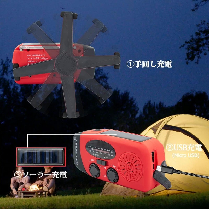 (3 Charging Methods) 3 charging methods: 1. Hand crank charging and hand crank radio: You can charge it by turning the handle on the back of the product. Suitable for a variety of environments. Rotate the handle for 1 minute (handle revolutions over 130) for 15-20 minutes of light use; 5-20 minutes of medium volume radio; 3-5 minutes of phone calls. 2. Solar charging radio light: When the solar panel is turned towards the direction of sunlight, it can be charged automatically. 3. Charged by USB cable via the included USB cable.