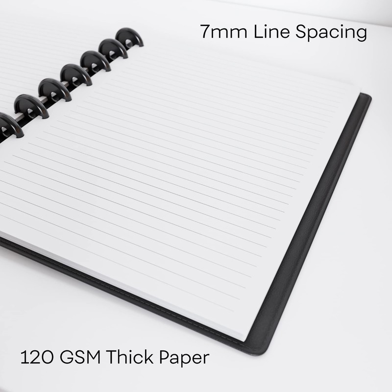 - Paper Stats: 7 inch x 9.25 inch, 120 GSM thickness, white paper, lines spaced 7 mm apart, pre-punched 9 “mushroom” holes for discbound organizers and planners.