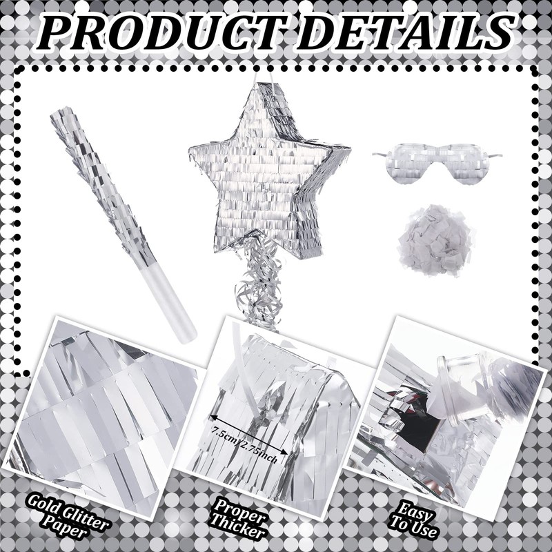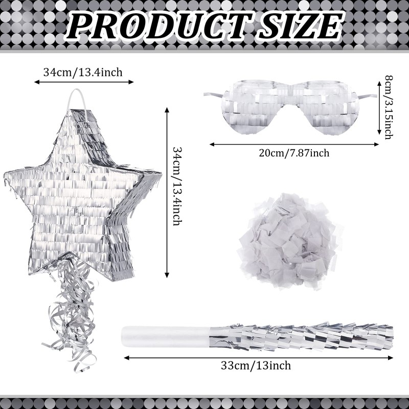 - You Will Receive: the package includes 1 piece of silver disco ball pinata with size 13.19 x 13.19 x 3 inches, with decorative tassel below, 1 piece of silver blindfold, 1 piece of silver stick, 1 pack of 20g silver confetti; Such a nice combination to meet your needs for party