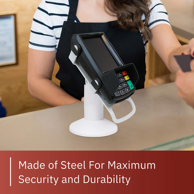 Our Dejavoo Z3 / Z6 Swivel and Tilt POS system stand is a metal credit card machine holder custom designed for the Dejavoo Z3 / Z6 payment terminal to make your in-store card purchases more stable and secure. Ensure that your electronic accessory is safe with our durable mild steel construction stand. This stand can tilt up to 60 degrees and swivel a full 190 degrees, making swiveling your POS terminal from customer to merchant easier to enhance the customer experience. By using the POS terminal holder, you decrease the amount of friction for customers purchasing items in your store, leading to happy and returning shoppers. The Swivel and Tilt Dejavoo Z3 / Z6 POS stystem stand is essential for any retailer such as a corner store or brick-and-mortar venture. Flange cover conveniently hides wires and mount keeps your terminal secure for minimized chances of damage and theft. Investing in a POS terminal is essential for any business; our Dejavoo Z3 / Z6 Metal POS system stand helps you protect that investment over time. Fits Dejavoo Z6 HW # v1.3; not compatible with HW # v1.4. If you are unaware of what Z6 you possess, please check the back of your device.