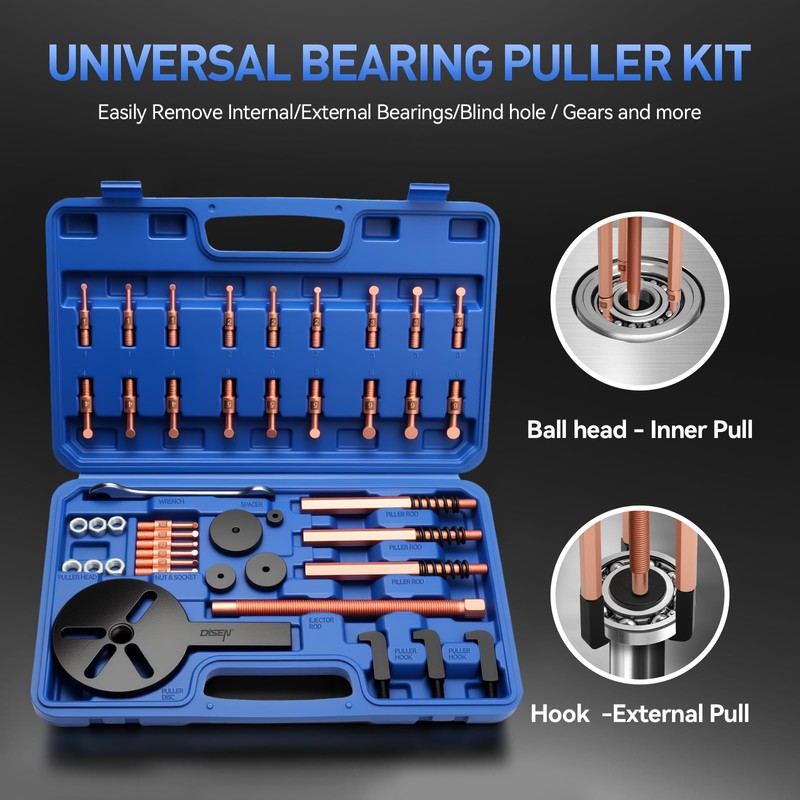 - Package Included- Includes :1 Ejector rod; 24 Puller heads and 3 hooks; 3 Puller rods for connecting hooks or collets to the disc;1 bearing disc; 4 Ejector Rod Spacers for deeper bearings; 1 Open end wrench; 6 screw nuts