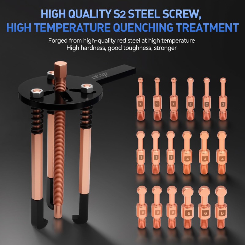 - The upgraded puller heads and hooks are made of high-hardness red steel, which is more durable than traditional ones. Other accessories are forged from high-quality chromium vanadium steel. After heat treatment, features high hardness, high toughness, and not easy to rust.