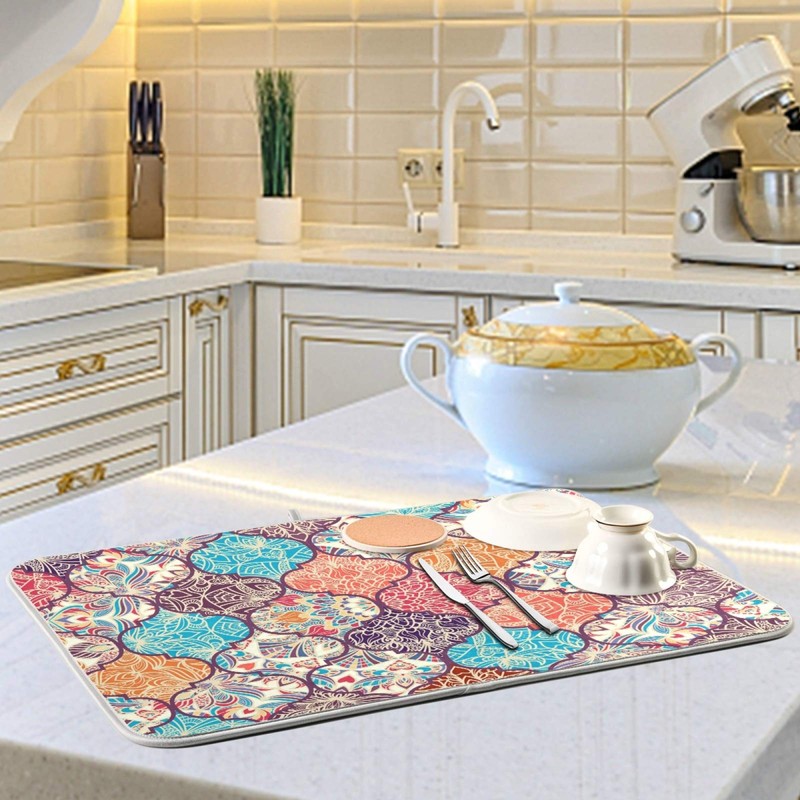 Dish Drying Mat for Kitchen Colorful Boho Moroccan Absorbent Heat Resistant Dishes Drainer Pad 16 x 18 Inch