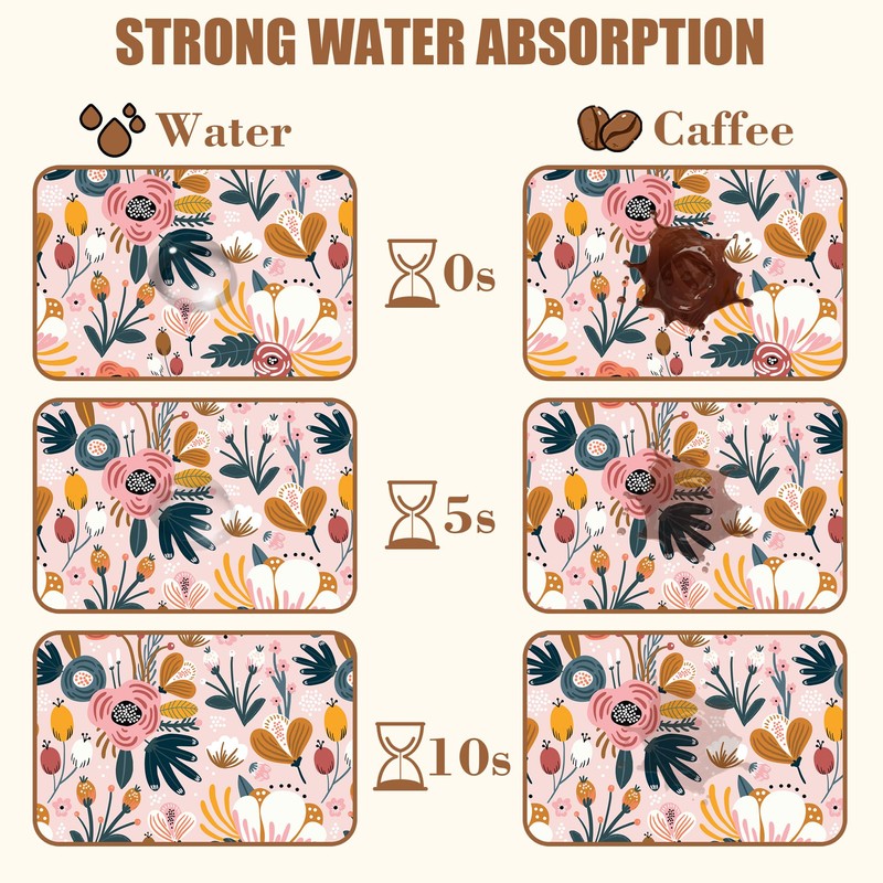 - 【Absorbent & Quick-Drying】The surface of this coffee mat is made of absorbent microfiber and the middle is made of composite sponge, which can absorb up to 4 times its weight in water and has a strong water absorption capacity. The high-density design makes it fast drying and can quickly absorb spilled liquids to keep your counter or desktop dry