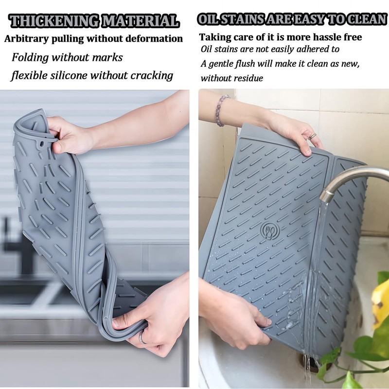 - Dish Drying Mat-- Silicone Dish Drying Mat Each fold has a cute knife and fork pattern in the center, which is not only a fun kitchen-themed decoration but also serves as an efficient drainage channel to ensure that the water is quickly drained, with hook for easy hanging and can also be rolled up, saving space.