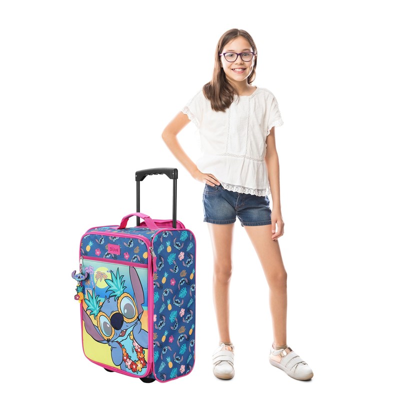 - Character Design: Travel the world with your favorite character in tow! This 18” pilot case features a big, colorful graphic of Disney's Stitch looking ready for the beach, with a vibrant all-over print of Hawaiian motifs as an added detail.