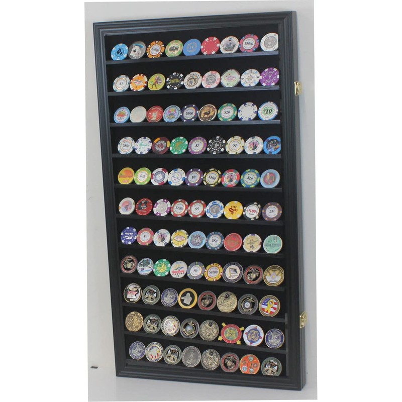 DisplayGifts Military Challenge Coin Display Case Poker Chips Holder Wall Cabinet Showcase Storage Rack with 11 Shelves for Coin Collection Solid Wood Wall Mount Black Finish Frame