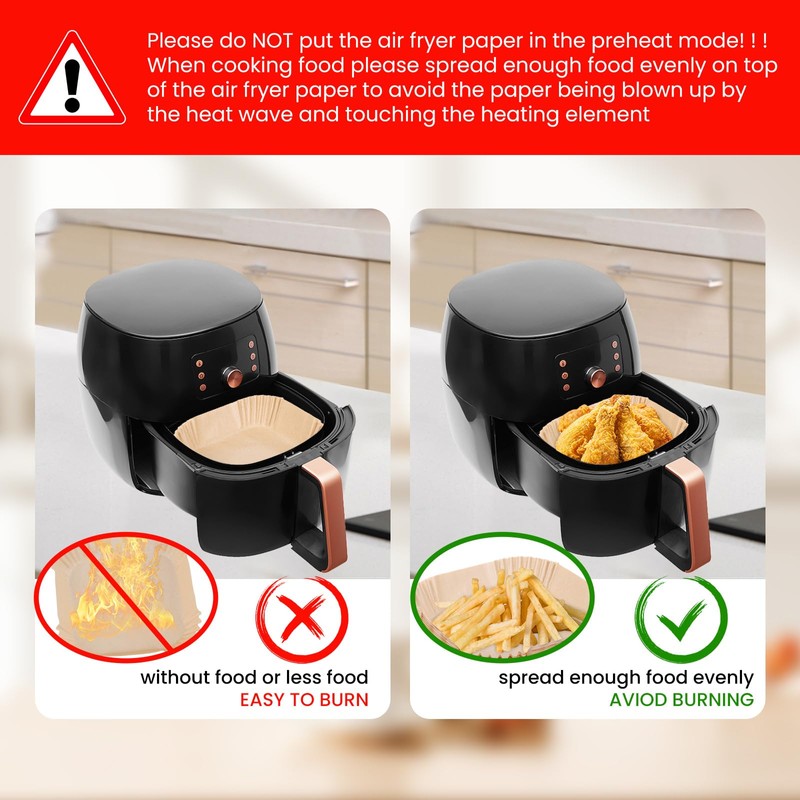 - 【Avoid Burning & Tips】Read the instructions first before use those air fryer parchment liners for ninja air fryer.Make sure to NOT put the air fryer disposable paper liner without food in the air fryer while it is in pre heat mode!!! Hot air blowing the lightweight paper onto the heating duct will easily catch the cooking paper to burn,So it is IMPORTANT to remember to place enough food on top of the non-stick disposable paper liner to avoid the air fryer sheets being blown away.