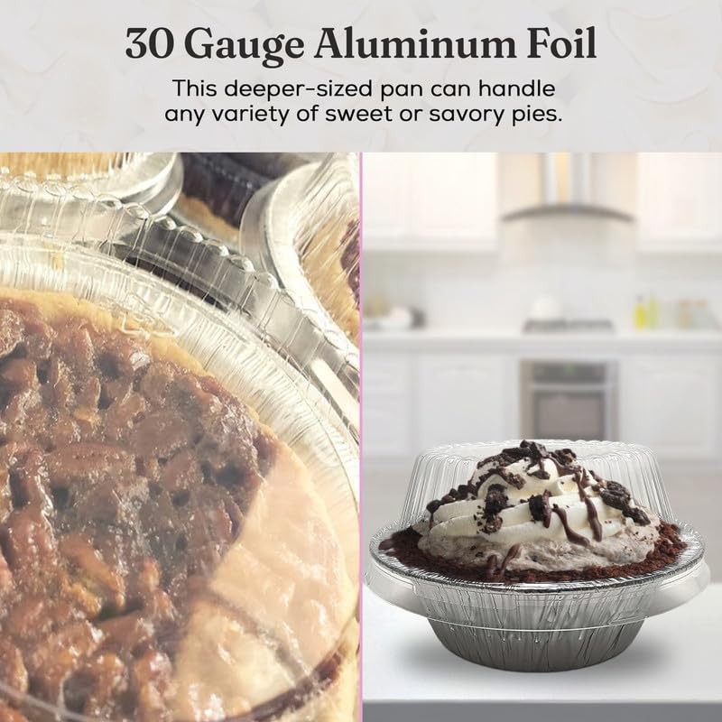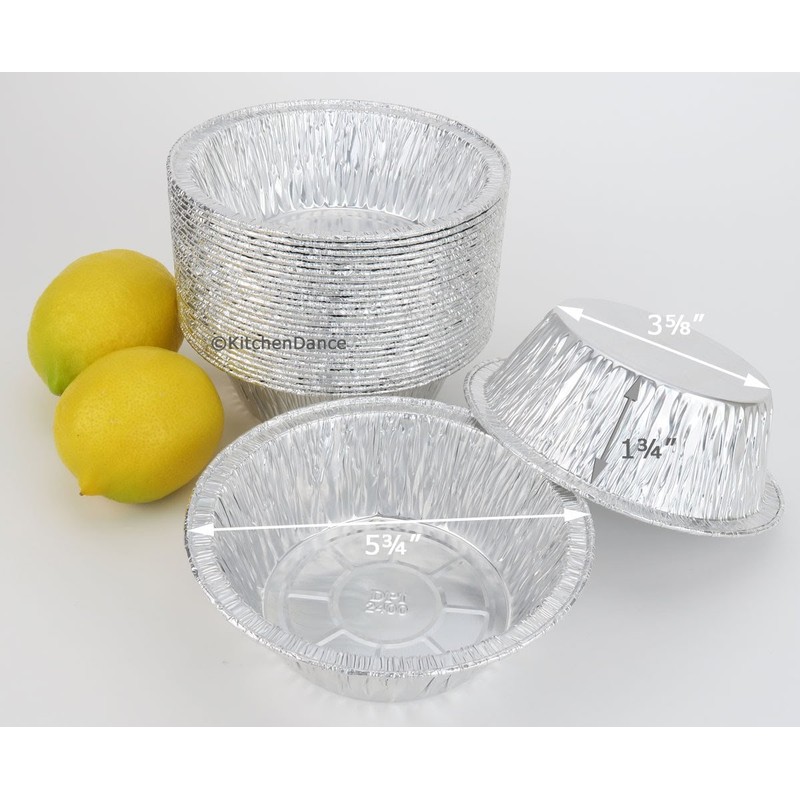 For pot pies and meat pies, cobblers, casseroles, and any number of individual food dishes. A quality pan, made in USA, perfect for a large individual serving. This pan is 1-3/4" deep. The clear plastic lid adds 1-1/4" in height. Note that the pie crust must be narrow to accommodate the lid, which snaps on the rim of the pan. This lid will interfere with the crust if it lays on the lip of the pan, so please plan to have the crust kept off the rim of the pan. Note: Lid is NOT heat resistant, do not cook with lid. Top outside diameter (rim to rim): 5-3/4” Top inside diameter: 5” Bottom diameter: 3-5/8” Depth: 1-3/4” 30 gauge aluminum foil Capacity: 14 fluid oz.
