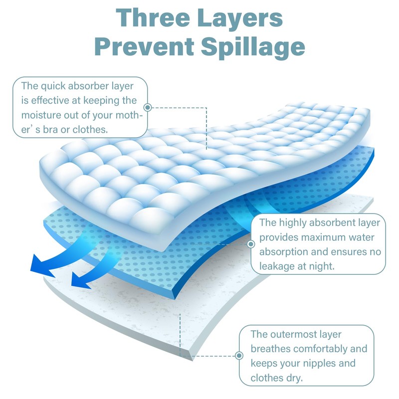 - Super Absorbent Day and Night Dry:Instant absorption and long-lasting moisture lock, with a polymer layer, fast absorption of breast milk and effective moisture lock, keep dry and comfortable, effectively lock milk, with a leak-proof layer of the inner core effectively prevent leakage, providing confidence and peace of mind.