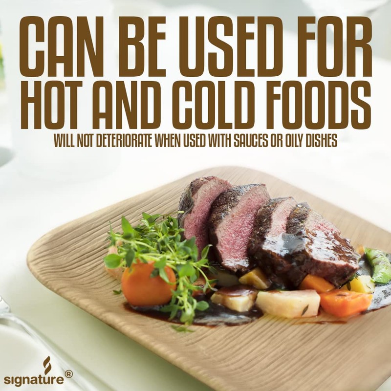 - So Strong You Won't Believe They're Disposable - While palm plates are biodegradable compostable plates they are surprisingly strong and durable so they won't become soggy or lose composition when used with hot foods, cold desserts, or liquids. Nothing to worry about messy spills caused by punctures on white paper plates using Signature Palm Plates.