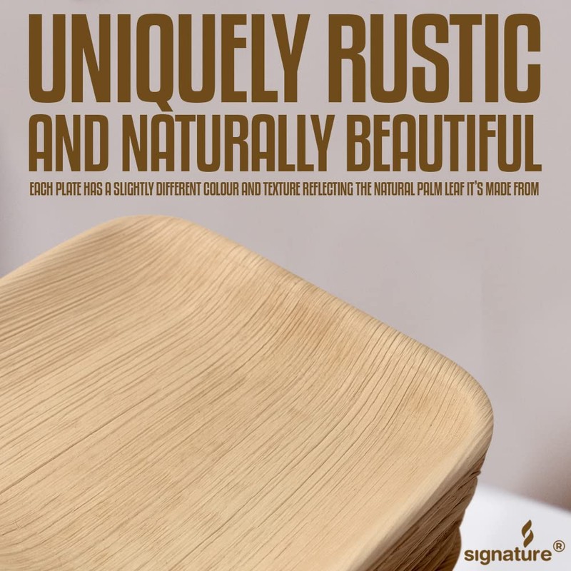 Signature Packaging is at the forefront of the development of eco friendly alternatives to plastic crockery and paper tableware. The newest addition to our line of biodegradable dishes are these 100% all natural palm plates made from fallen palm leaf branches. The leaves are collected, washed, cut, and pressed without the use of any additives or chemicals. You'll notice their interesting slightly uneven shape and visible grain - this gives them an eclectic, rustic, and natural aesthetic that's a part of their beauty and style.