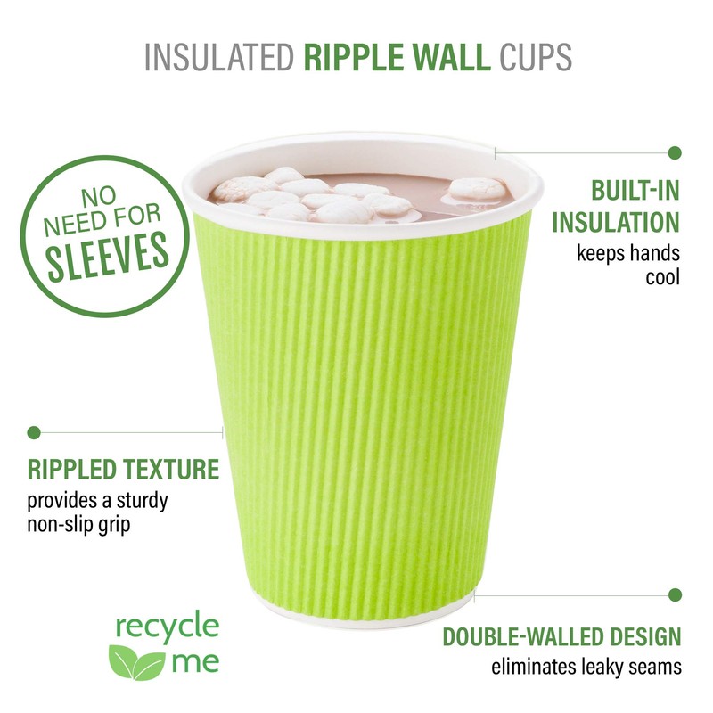 - STURDY & DURABLE: Made with premium paper, these green paper cups hold hot drinks for a long time without getting soggy. Plus, the ripple wall design protects your fingers from burning!