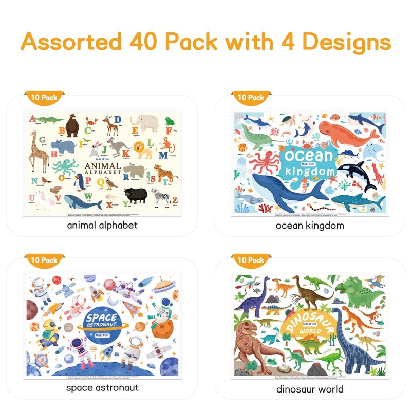 - Fun and Educational Design: 40 pack kids placemats, with 4 different pattern designs. Rich and interesting patterns, attract baby's attention, make meals more interesting, and parents can also relax beside. Our disposable baby placemats can also promote cognitive development, help baby recognize animals, letters, colors, etc
