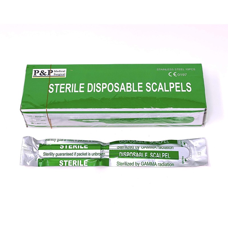 Disposable Scalpels Sterile Surgical Blade Size 22 Stainless Steel with Plastic Handle & Metric Line Individually Foil Wrapped by P&P MEDICAL SURGICAL Box of 10