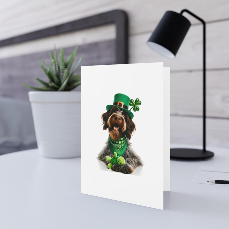 Looking for a pawsome way to add some luck to your celebrations? Our Wirehaired Pointing Griffon St. Patrick's Day Note Card is the perfect choice! Measuring at 4x6 inches when folded, this eye-catching card showcases a delightful design of your favorite Wirehaired Pointing Griffon in a St. Patrick's Day theme. Blank on the inside, it provides ample space for personalized messages, making it great for any occasion. Each card comes with a crisp white envelope, ensuring easy gifting or mailing. Spread the festive spirit and show your love for this charming breed with our Wirehaired Pointing Griffon St. Patrick's Day Note Card!