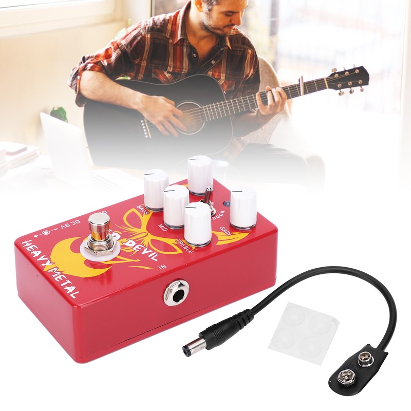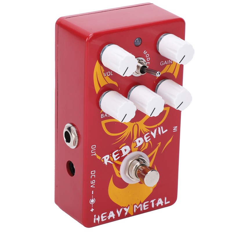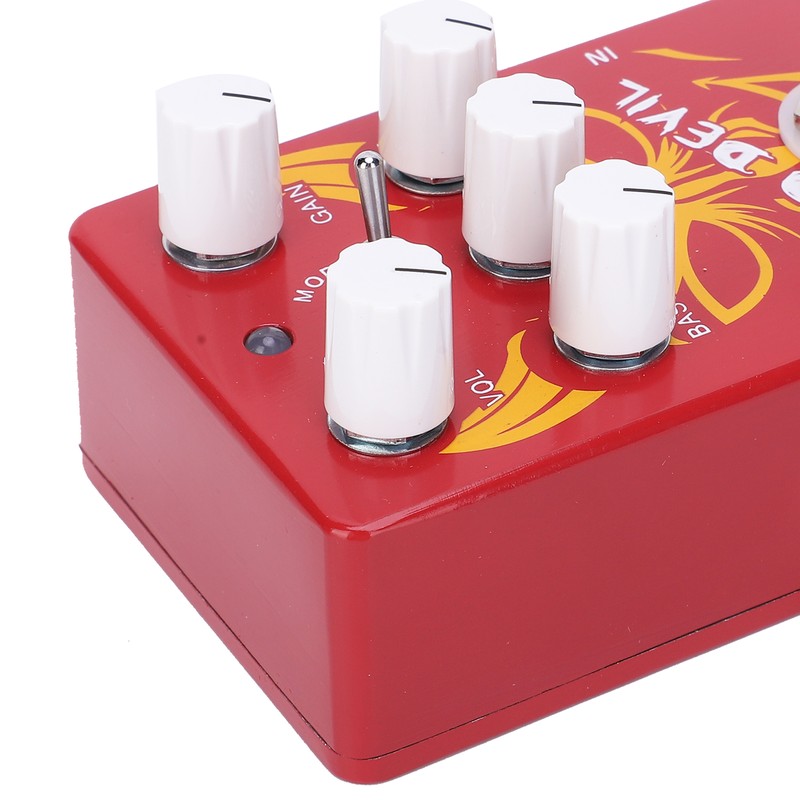 1、High gain distortion pedal with mini EQ that allows you to adjust bass, midrange and treble 2、There are two-way switch, sounds smoother on Vintage, but defined on Modern 3、Combined with volume and gain control, you can try various severely distorted tones available 4、Red devil pattern shape, which looks very passionate, fashionable and avant‑garde 5、The effect pedal is an important musical instrument accessory, which can be given as a gift to guitarists or music lovers