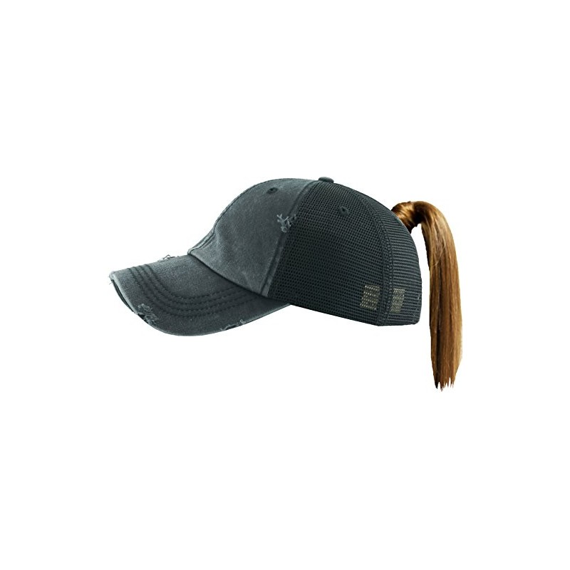 Distressed Trucker Washed Dad Hat Messy Bun Pony Cap - Black Mesh
