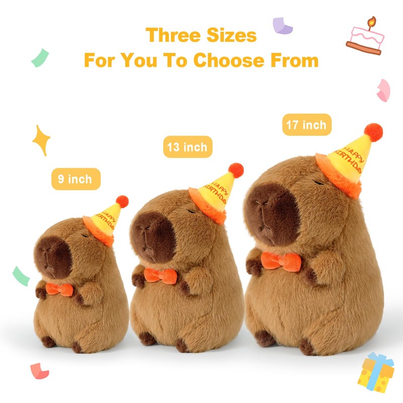 The capybara stuffed animal plush toy with birthday accessories, and the combination of capybara and birthday theme will be deeply loved by everyone.