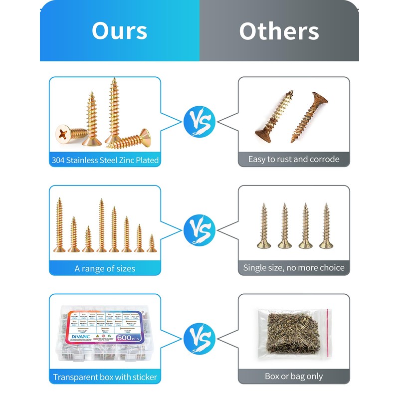 - [Advantage] DIVANC wood screws threads are very precise, clean and sharp, deep and clear threads can easily penetrate wood and plastic, to ensure a solid fixation, while not easy to deformation and sliding use. Resists backing off even after prolonged vibration, ideal for outdoor/indoor woodworking