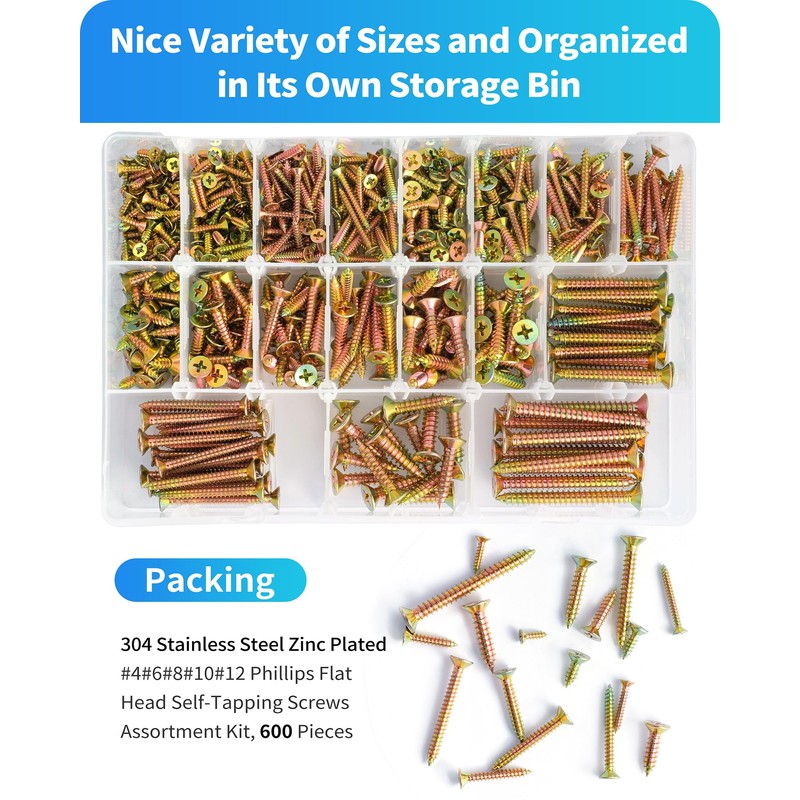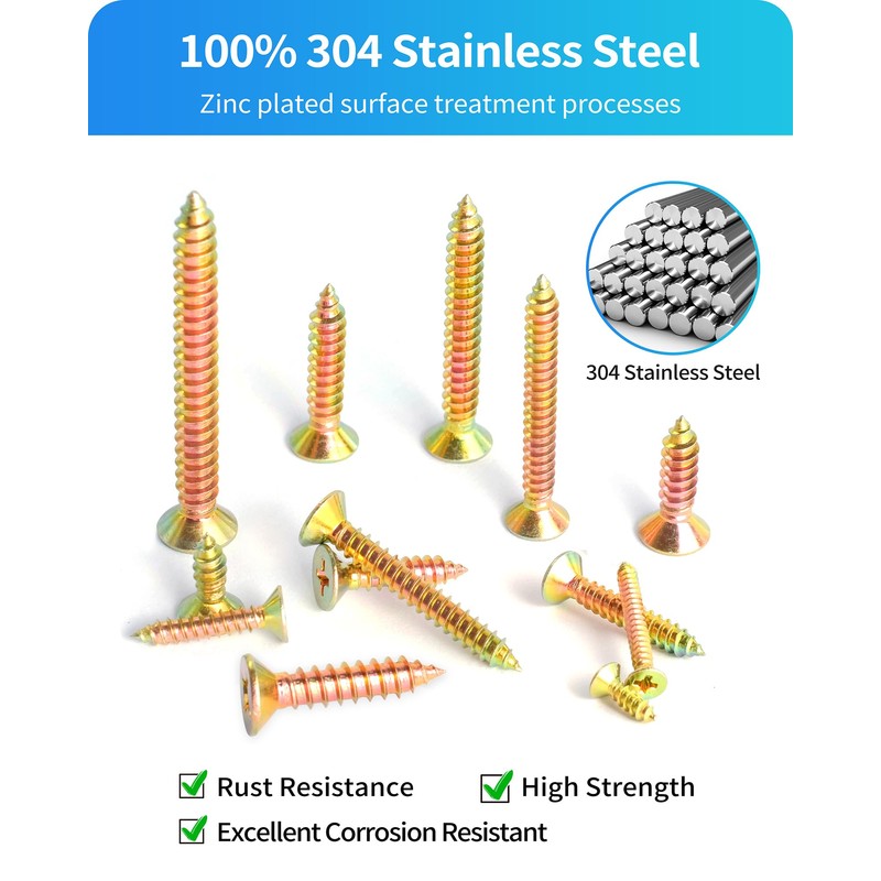 - [Screw Size] #4x3/8", #4x1/2", #4x3/4", #4x1", #6x1/2", #6x3/4", #6x1", #6x1-1/4", #8x1/2", #8x3/4", #8x1", #8x1-1/4", #8x1-1/2", #10x3/4", #10x1", #10x1-1/2", #12x1", #12x2" stainless steel wood screws, phillips flat head self-tapping screws, total 18 commonly used sizes, different sizes can meet your different daily needs