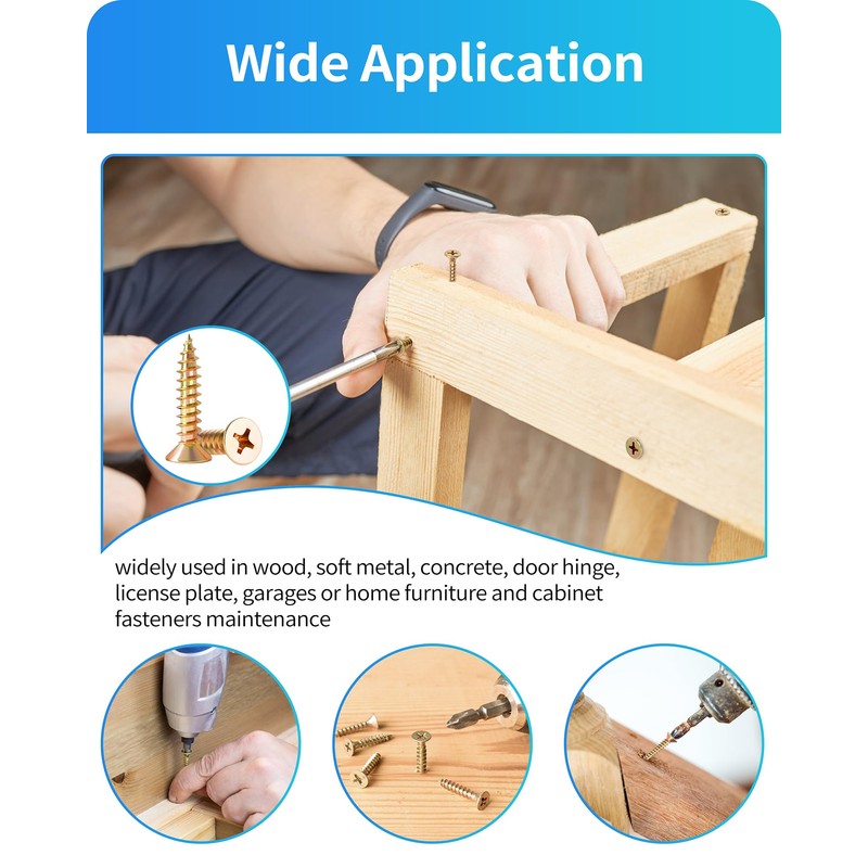 - [Wide Application] These stainless wood screws is the most popular fastener in daily life, widely used in wood, soft metal, concrete, door hinge, license plate, garages or home furniture and cabinet fasteners maintenance