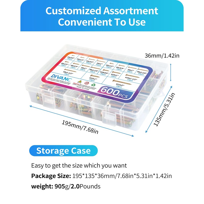 - [Storage Box] Sturdy case package with size label. All the wood screws are organized in a transparent box, with small dividers in it, will not mix up, convenient for users to get correct sizes