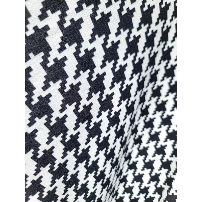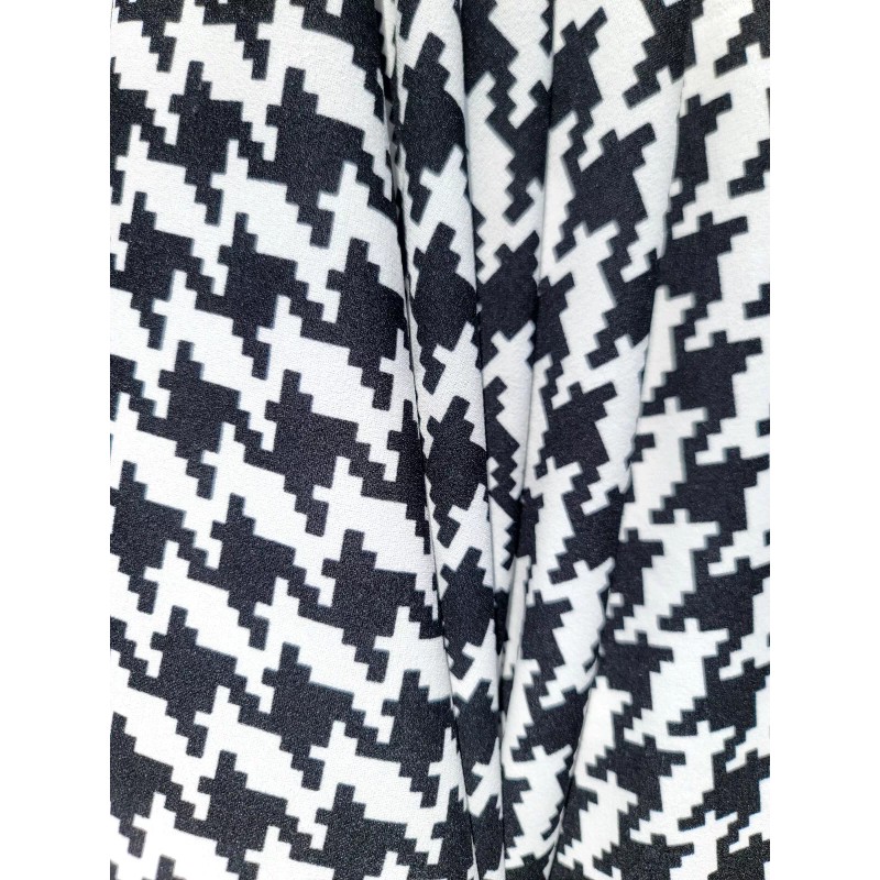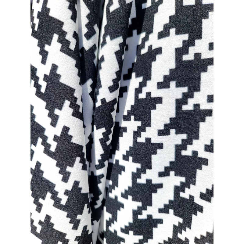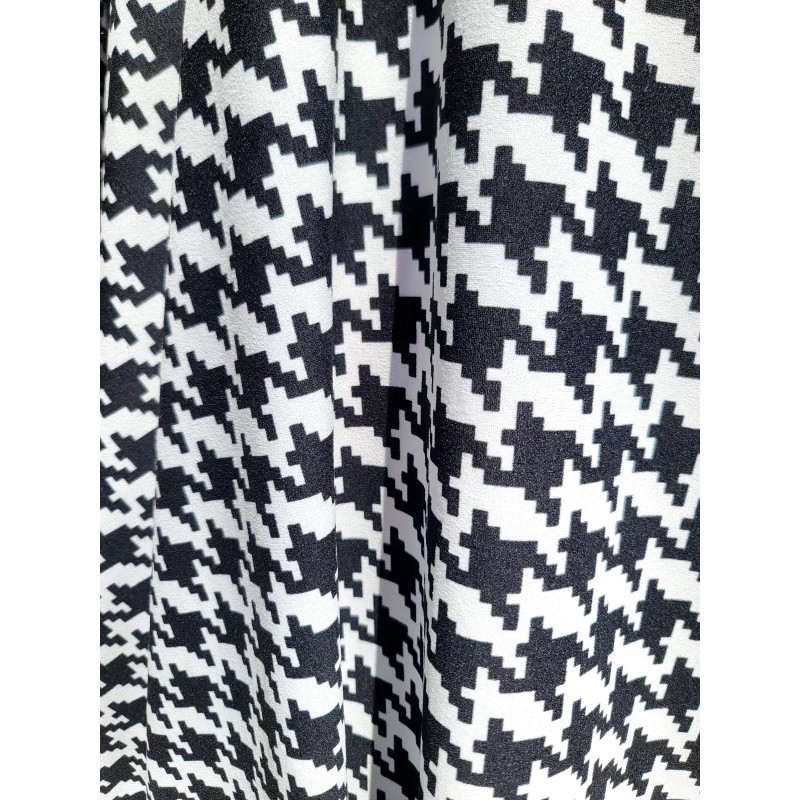 The fabric is suitable for use in creating dresses, table tops, dance/sportswear, costumes, loungewear, coats/jackets, and swimwear. It is also good for crafts and pillows. The fabric is not handmade and is made in Korea, Republic of. The pattern is houndstooth and the color scheme is black and white. This fabric is sure to be a versatile addition to your collection!
