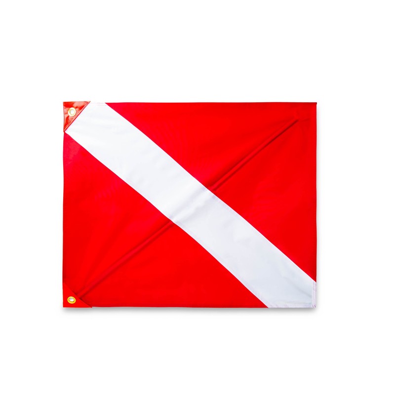This 20" x 24" Red and White Diver Down Flag is a must when going on any diving expedition. Place this flag on a pole or float to warn other boaters and watercraft there is a diver in the water. Boats and other watercraft must go slow and stay away when the flag is on display. Regulation sized dive flags are required by law in many states and recommended everywhere when spearfishing, scuba diving, snorkeling, lobster snaring, free diving, or anything else that involves a diver is in the water. This Flag is easily attachable to a pole with zip ties (2 Included) or carabiner clips to display from your boat, kayak, jet ski or float. The bright and vibrant colors in this flag will make it impossible miss.The included stiffener breaks down into 3 small sections to make your flag travel sized and vacation friendly. Laws about dive flags vary by state. Check your local laws for more information. This is the legal size and specification for Florida. The stiffening pole is required at all times in Florida but only recommended to use else where when the conditions are calm. When there is a breeze the pole is not needed as the flag will fly on its own. Perfect for all conditions and situations!