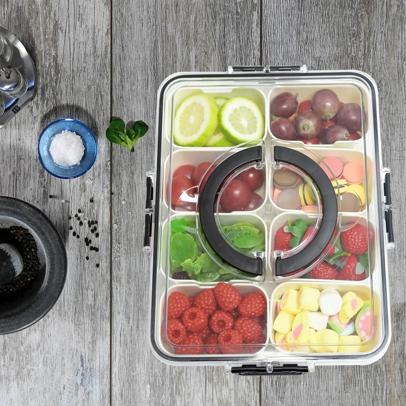 - 【Versatile Food Storage】Partitioned fresh-keeping box that can also be used as a fruit and snack tray. The serving container tableware can be widely used for serving candies, chips and dip, nuts, snacks, olives, charcuterie, crackers, cheeses, appetizers, fruits, veggies, meats and others. Ideal for home, catering, picnic, BBQ, office parties, birthday party, celebration, activities decoration, banquet facilities and any other indoor/outdoor events.