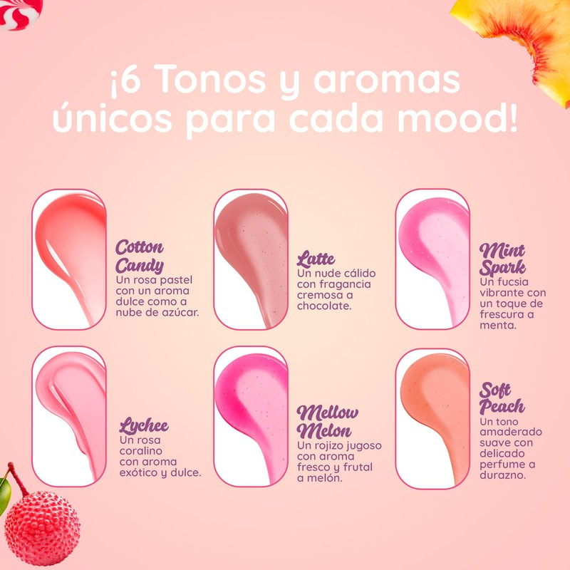 - 6 tonos irresistibles – Lychee, Mint Spark, Latte, Cotton Candy, Mellow Melon y Soft Peach, cada uno con su aroma único.