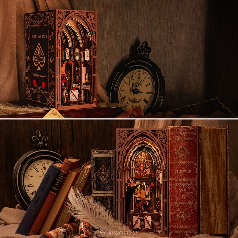 DIY Book Nook Kit, 3D Wooden Puzzle for Teens and Adults, Miniature Dollhouse Booknook Bookend Bookshelf Insert Decor with LED Light (Alice's Evidence)
