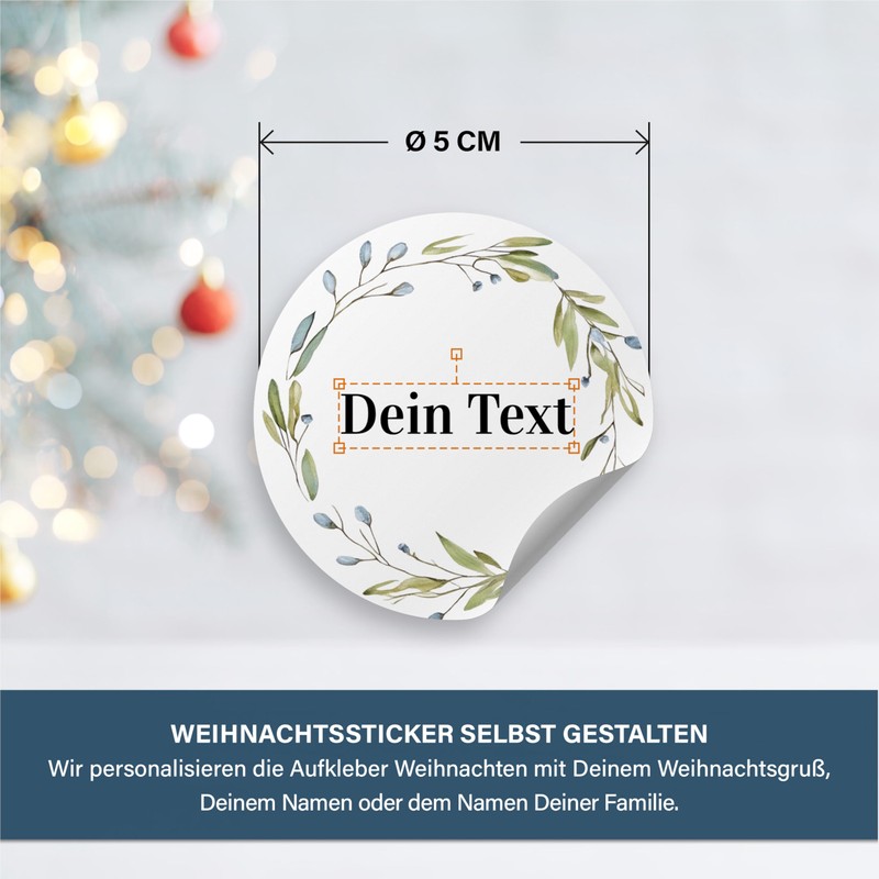 - Design Christmas stickers yourself: we make your Christmas stickers unique by adding your personal Christmas greeting, name or family name. Simply click on the button Customise now and add your desired text. A preview of your Christmas labels is immediately visible.