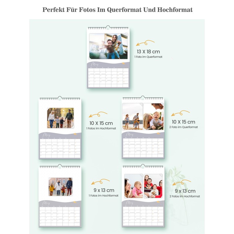 • DIN A4 portrait format: the annual calendar measures 21 x 29.7 cm (DIN A4 portrait), is spiral bound and offers easy space for photos up to 9 x 13 cm or 10 x 15 cm in portrait and landscape format and 13 x 18 cm in landscape format.