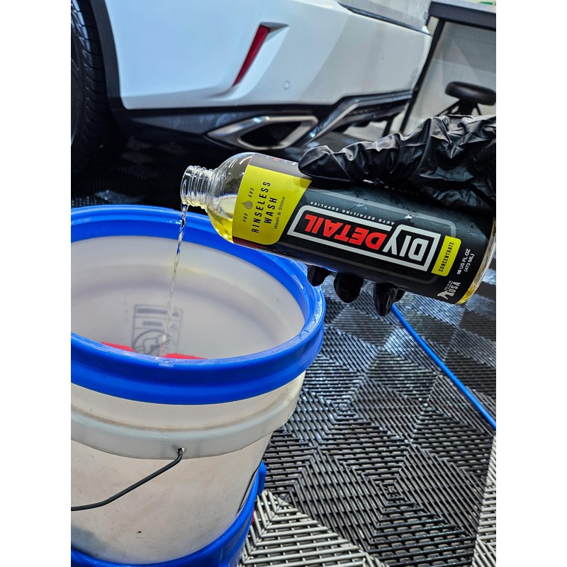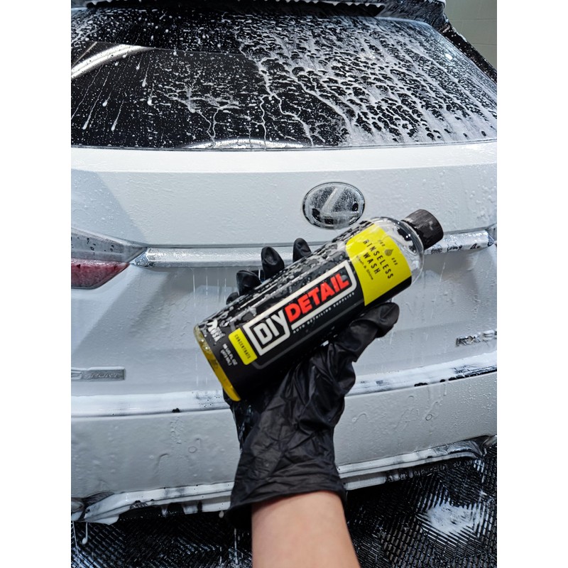 If you enjoy driving your car as much as you do cleaning it, DIY Detail Rinseless Car Wash is the product you need. DIY Detail Rinseless Wash, safely removes dirt, filth, and road grime from any vehicle with NO HOSE, and NO Mess. This PH-balanced formula makes cleaning safe, fun, and quick. It works safely on all automotive paint colors and vehicle brands, including those with paint protection film (PPF) or ceramic coatings. Are you looking for an eco-friendly way to wash your car, without using a traditional car wash soap and facing water restrictions? Rinseless Wash aids in the conservation of gallons of water. A great time saver, DIY Detail Rinseless Wash is one of the most water-wise ways of keeping your prized ride clean. When you're done with the wash process, there is no need to rinse it! Simply wipe down your car panel at a time and enjoy the shine! Directions: Hand Washing: Add 1 oz of Rinseless Wash to 2 gallons of water in a bucket or rinse bucket. Soak a plush wash mitt or towel in the bucket and wash one panel at a time using straight lines until clean. For a vehicle with PPF or ceramic coated surfaces, this gentle wash solution ensures optimal cleaning without compromising the protective layers. Dry each panel using a clean plush microfiber towel. Foam Cannon: Add 4-5 ounces of Rinseless Wash to your foam gun/cannon and fill with water. Spray the car, then use a wash mitt soaked in a rinseless solution bucket and clean each panel at a time in straight lines. This method is particularly effective when dealing with a larger vehicle or when using a foam cannon in conjunction with a pressure washer. For best results, apply the rinseless wash to a semi-clean cool surface. The rinseless wash's unique formulation helps provide a lubricating effect, reducing the chances of scratches during the wash process. Additionally, it eliminates the need for a separate drying process, saving you time and effort. By using DIY Detail Rinseless Wash, you not only