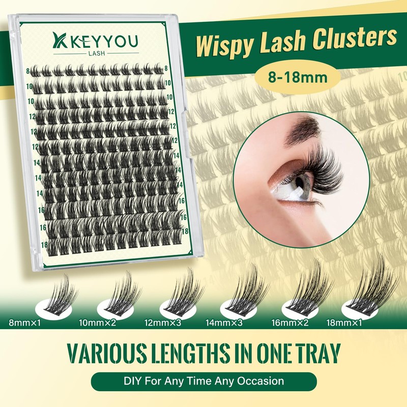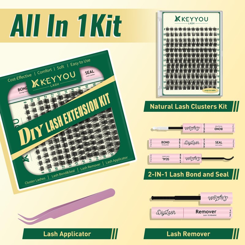 DIY Eyelash Extension Kit KEYYOU LASH 144 Pieces 8-16 Mix Eyelash Cluster Eyelash Extension Kit with Bond and Seal, Remover, Applicators for Beginners at Home (KY06 Kit)