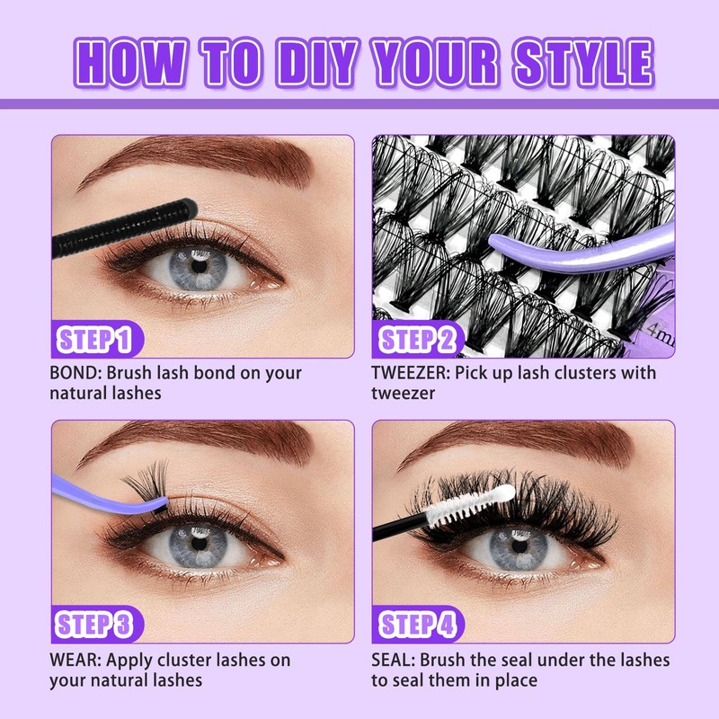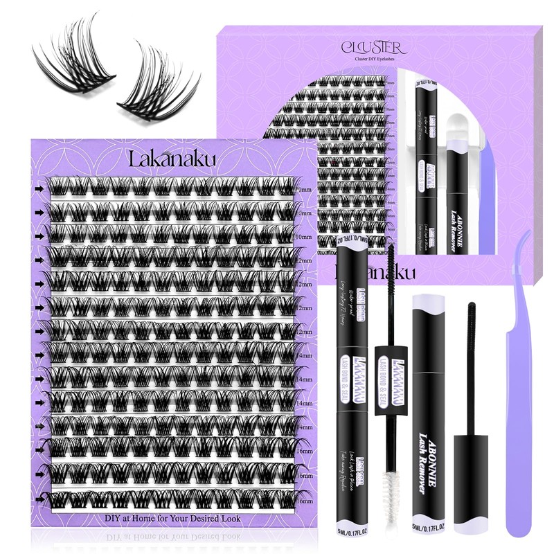 - DIY eyelash extension kit: buy DIY eyelash kit you will receive: 1 tray 280 pieces mixed length cluster eyelashes, 1 eyelash glue and seal (2 in 1), 1 eyelash remover, 1 eyelash applicator tweezers. This cluster eyelash extension kit will meet all your needs for DIY eyelashes at home, perfect for beginners and eyelash lovers