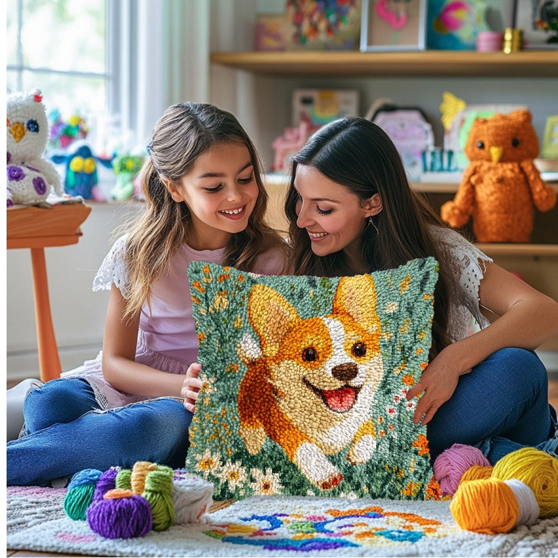 DIY Latch Hook Pillow Kits for Adults Welsh Corgi Dog Running in Flowers Printed Pillowcase Crochet Yarns Hooking Handmade Pillow Cover Cushion for Home Sofa Decoration 17x17inch-3