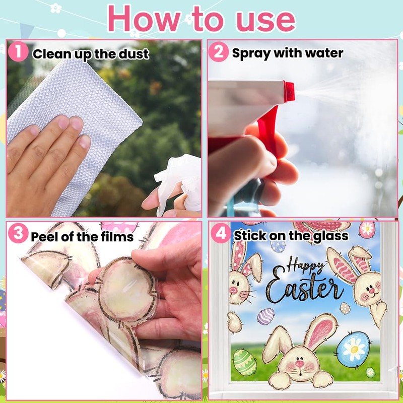 - Easy to Use Easter window decoration no need adhesives or glues, just clean the surface of the object and spray a little water before pasting, tear off the pattern and install it on smooth surface then gentle press. It sticks very firmly and won't fall off easily