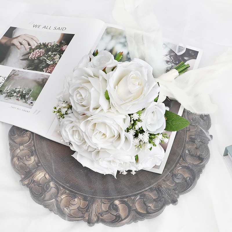 - The faux bridal bouquets consists of white flowers, baby breath and greenery. Made of high quality plastic and silk, easy to hold and carry.