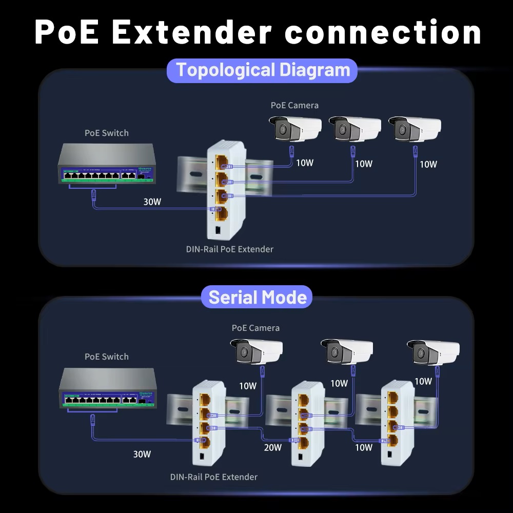 - 3-Port PoE extender can forward both Ethernet and PoE power for 1 terminal equipment via Cat5 ,Cat5e,Cat6,Cat6e,UTP cable.