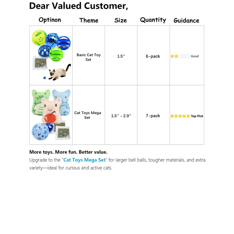 • Looking for more variety and durability? The "Cat Toys Mega Set" includes bigger balls with bells, more types of interactive toys, and tougher materials—offering more fun and longer-lasting playtime for your cat.
