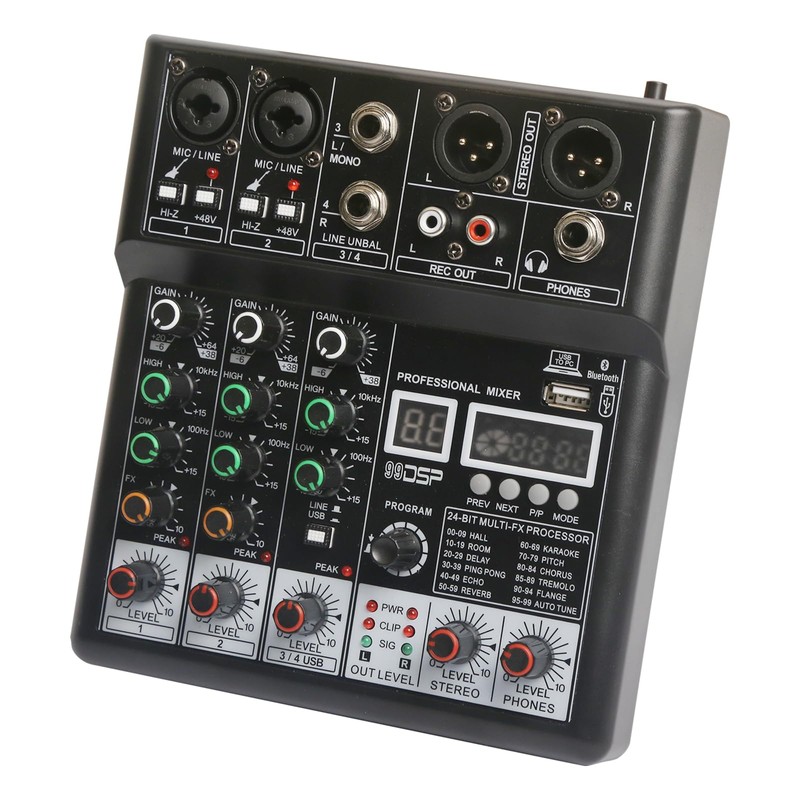 Dj Mixers, 4 Channel Audio Mixer, Sound Board with Bluetooth Player, Usb Audio Interface with 48V Phantom Power, Sounds Mixer Board with 99 DSP FX Reverb Delay Effect