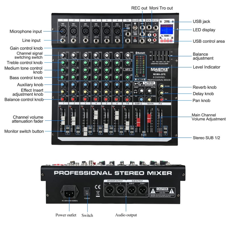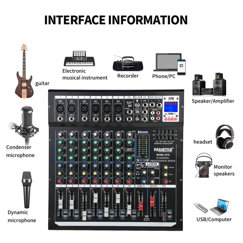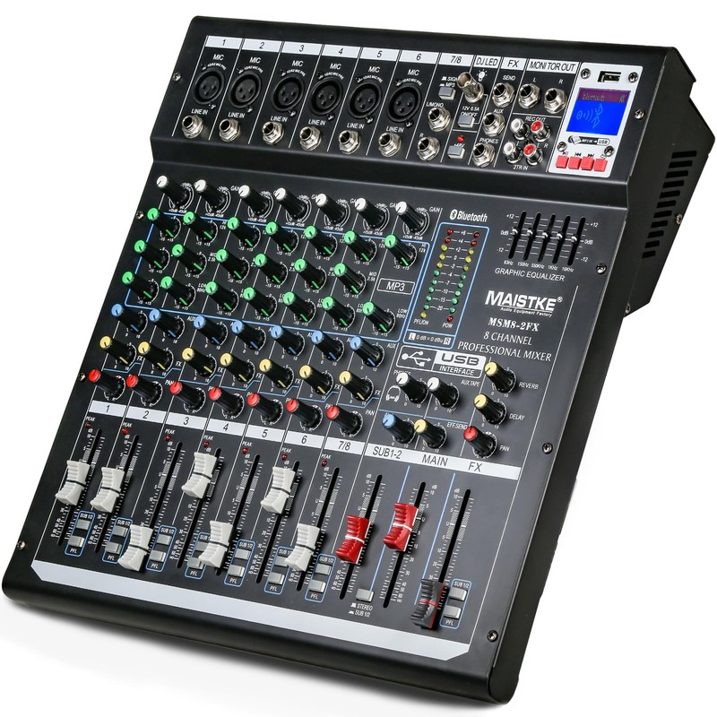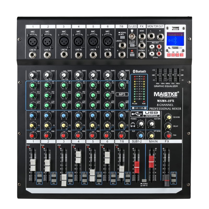 - This professional 8-channel tuner microphone single-channel 3-band equalization adjustment, 5-band master equalization adjustment, 8-channel input, stereo main output, 2-channel SUB group output, and high-precision faders provide better tone adjustment control.