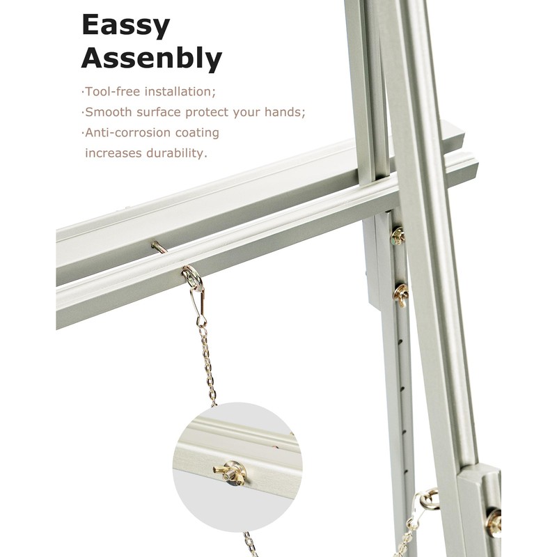 - Diversified Adjustment Options: This easel stand for sign occupies a space of approximately 35''L*46''W*58''H, with a 25-inch long and 1 1/2-inch deep tray to hold boards of different shapes and thicknesses. It also provides you with a 32"-23" adjustable tray height, and a 0-75 degree adjustable angle. It can turn it into a tabletop easel stand for sign without assembling the three bottom support legs as needed.
